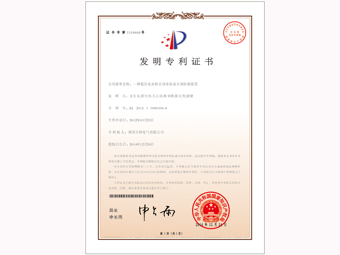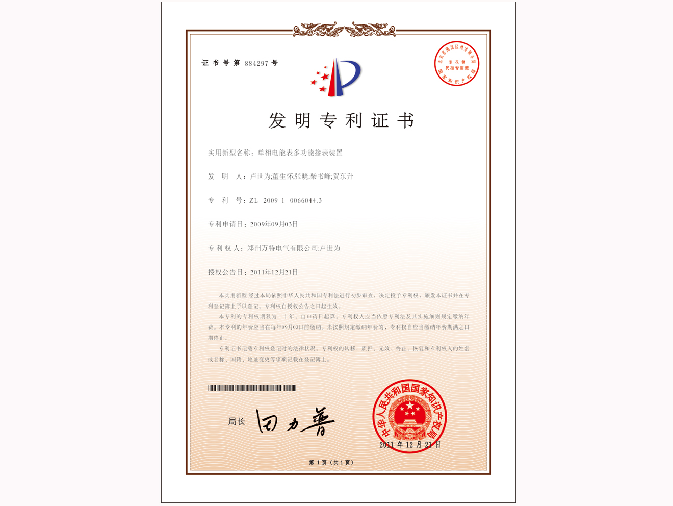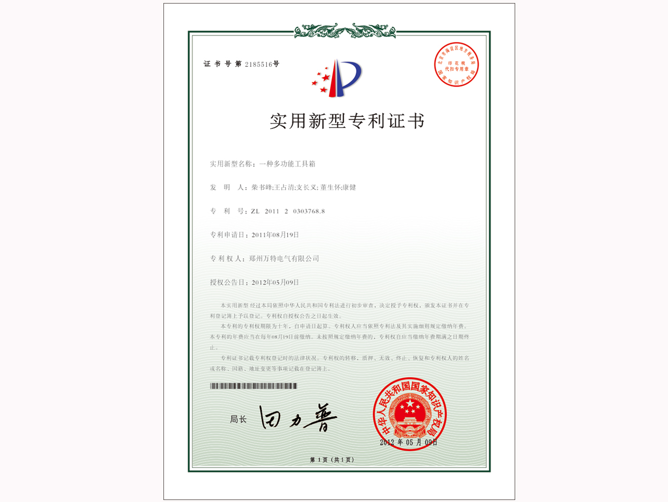 公司实用新型专利证书